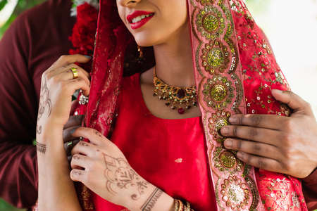 An unrecognizable bride on indian wedding ceremony, traditional wedding ritual of marriage.