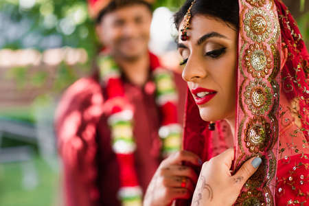 Indian bride in sari and headscarf near blurred man in turban on background