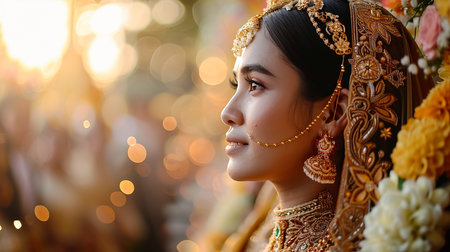 Portrait of beautiful young asian Thai girl. Woman model with black and gold traditional India costume.