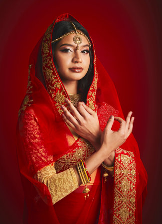 Indian woman, studio and culture with mudra, portrait and magic for culture, yoga and fashion by red background. Girl, model and beauty for fantasy, jewellery and art with clothes for festive event