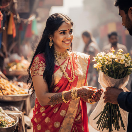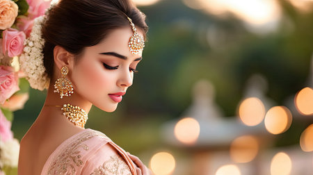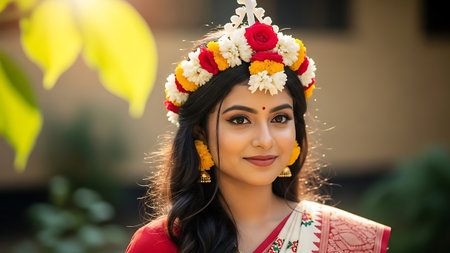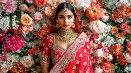 Beautiful indian woman in traditional sari surrounded by vibrant floral backdrop. concept of cultural elegance, festive fashion, ornate jewelry, floral beauty.