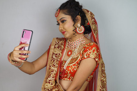 Beautiful Indian Bride in traditional hindu wedding attire with lehnga, bridal bangles and shy pose