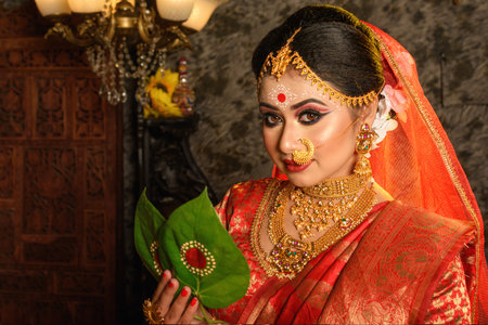 Portrait of very beautiful Indian bride holding betel leaf, Bengali bride in traditional wedding saree with makeup and heavy jewellery in studio lighting indoor