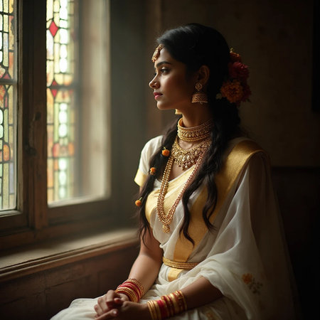 A portrait of a young, 30 something, Indian woman with long black hair, dressed in traditional Indian attire (sari), next to a large window reflecting palm trees