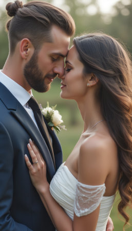 A handsome groom in a navy suit leans in closely to his beautiful bride, who wears a stunning off-shoulder wedding dress. Their foreheads touch gently, radiating love and tenderness in a serene outdoor setting.