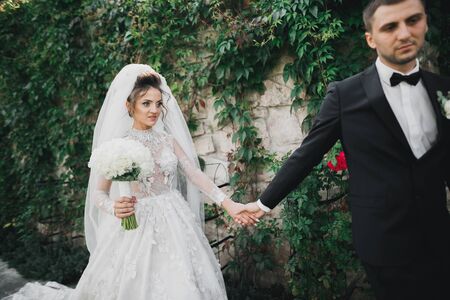 Bride and groom at wedding Day walking Outdoors on castle territory in summer. Bridal couple, Newlywed woman and man embracing with love. People happy and smile. The bride to the groom's hands. Happy couple in love look at each other