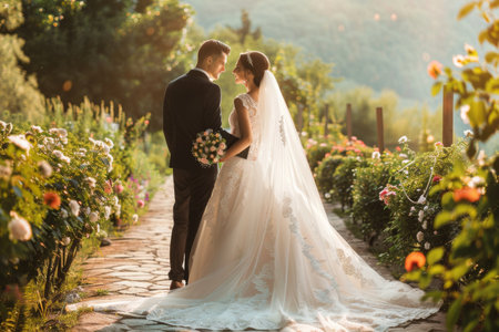 A beautiful bride and groom standing in a garden Ai generated