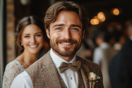 A confident groom with a beard and striking blue eyes smiles warmly while standing in front of his bride. The couple is dressed elegantly, and guests can be seen enjoying the vibrant atmosphere of the celebration.