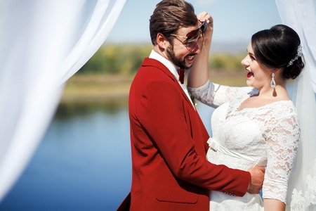 Bride and groom fooling around at a photo shoot after the ceremony, inside the arch with white cloths fabric. Wedding Color Marsala. Man in sunglasses surprised girl takes off his glasses. Summer sun.