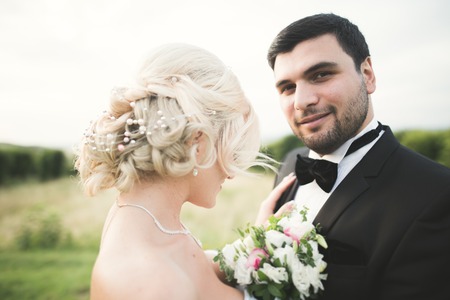 Happy bride and groom embracing in the field at sunset. Bride holding bouquet of flowers.