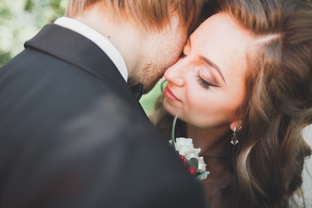 Beautiful bride and groom embracing and kissing on their wedding day outdoors