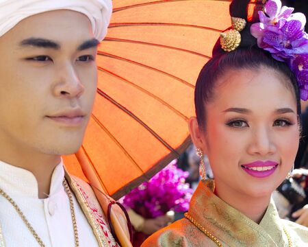 CHIANG MAI, THAILAND-FEBRUARY 4th 2017: Chiang Mai Flower Festival: picture of handsome young people dressed in traditional fashion. The woman wears an orchid crown on her hair and the man has a turban. He carries an umbrella.