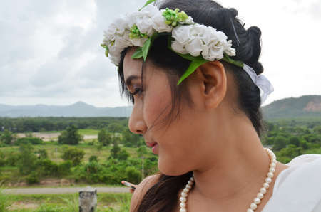 Beautiful girl in White Thai dress with red lotus flowers.Thai girl in retro Thai dress,Beautiful Thai girl in traditional dress costume