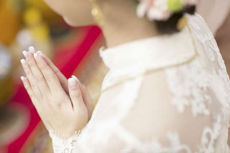 Attractive Thai woman in an ancient Thai dress holds a fresh flowers paying homage to Buddha to make a wish on the traditional Songkran festival in Thailand
