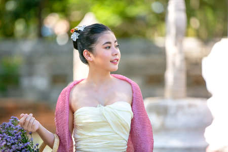 Beautiful asian woman wearing traditional Thai dress with flowers in background