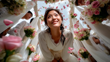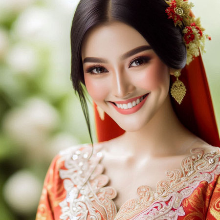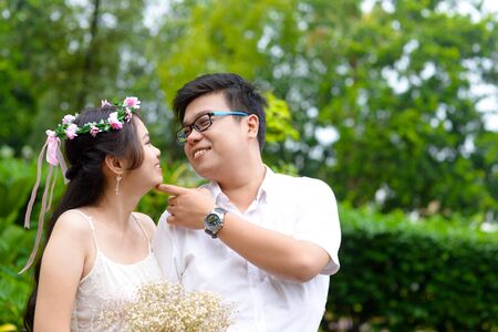 Wedding portrait of a smiling Asian woman with floral bouquet in outdoor garden setting. Bride with flowers. Concept of love, happiness, celebration, marriage.