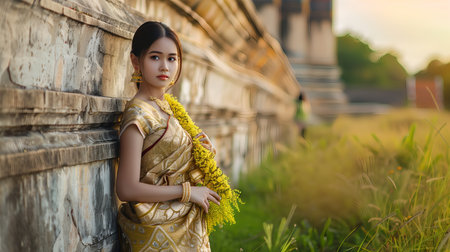 Attractive Thai woman in an ancient Thai dress holds a garland of fresh flowers paying homage to Buddha to make a wish on the traditional Songkran festival in Thailand