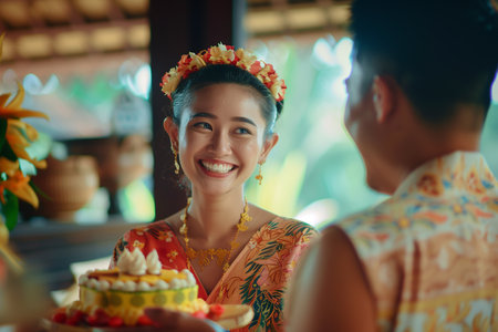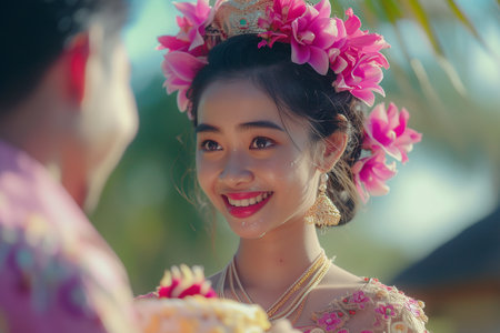 Generative AI Image of a Man Meeting a Beautiful Balinese Girl Wearing Pink Flowers Crown