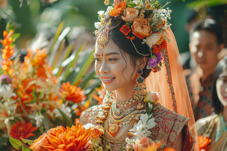 A woman dressed in traditional clothing is smiling warmly while standing amidst colorful flowers at a cultural festival. The setting is lively and festive, showcasing cultural heritage.