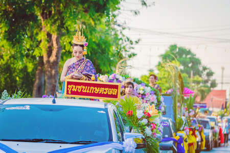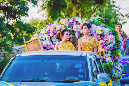 CHIANG MAI, THAILAND - FEBRUARY 08, 2020: Young men and women dressed in traditional clothe in the 44th flower festival parade in Chiang Mai, Thailand
