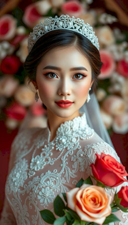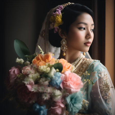 Beautiful asian bride in traditional dress holding bouquet of flowers