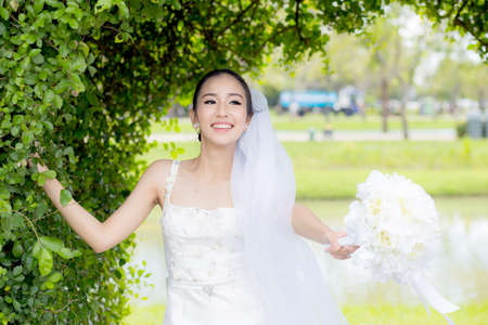 Beautiful portraits with natural light asian woman bride in wedding dress in nature meadow flower,standing in green grassy field in background.