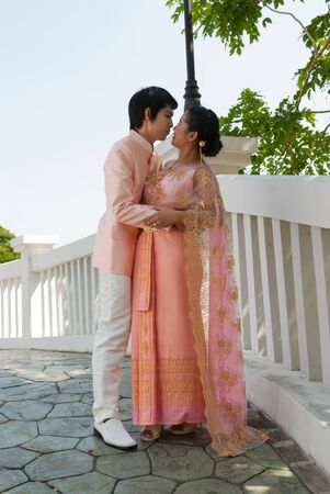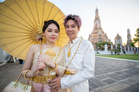 Portrait of thai couple in traditional wear at Wat Arun. High quality photo