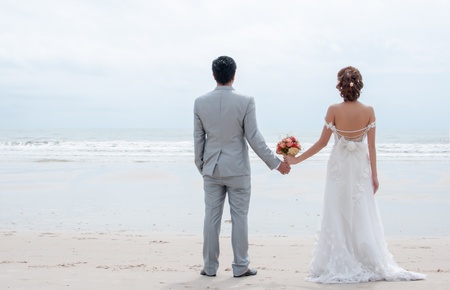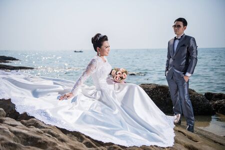Asian couple wearing wedding dress and suit for beach wedding ceremony. Couple on the beach concept. White bridal dress.