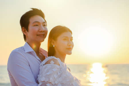 Young happy Asian couple hug on the beach, romantic travel honeymoon vacation summer holidays. Asian woman and man holding hands embracing outdoors on sunset background.