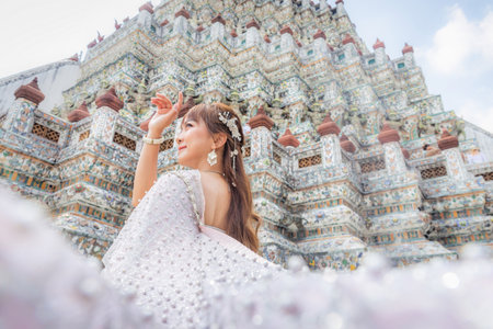 Close up of a young woman wearing traditional Thai dress with accessories standing at Wat Arun, a popular place for tourists around the world. Bangkok Thailand