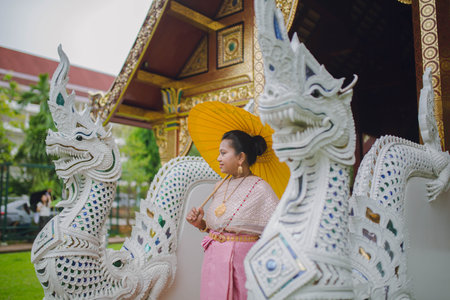 Portrait of an Smiling Young Woman in Thai Lanna Traditional Clothes are Smiling Young Woman Holding Flower Basket and and hold umbrella Against Thailand Temple