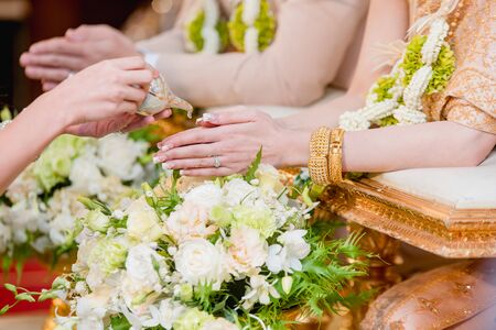 hand of a bride receiving holy water from elders in thai culture wedding ceremony