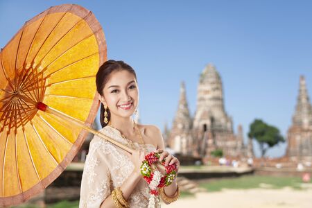 Young fashion and beautiful asian woman in Thai red traditional costume with antique umbrella and jasmine flower garland standing outdoor in ancient buddha temple Ayutthaya, Thailand. Travel concept