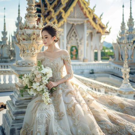 Beautiful asian bride in traditional Thai wedding dress and tiara