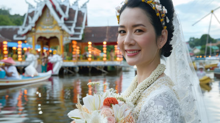 Thai bride smiling by waterfront with bouquet. Traditional Thai bridal attire at river festival. Happy Asian woman. Concept of happiness, Thai culture, bridal celebration, and picturesque ceremonies