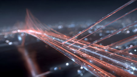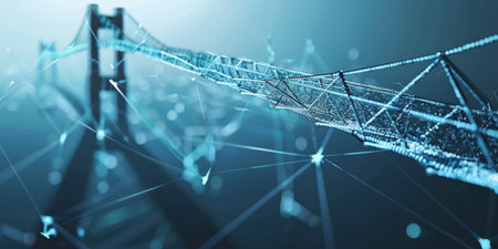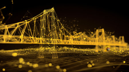 This striking digital illustration showcases a suspension bridge designed with interconnected lines and bright nodes, representing modern technology and connectivity.