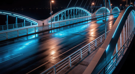 A bridge is shown in a blue and white color scheme. The bridge is made of a network of lines and dots, giving it a futuristic and technological appearance. Concept of innovation and progress