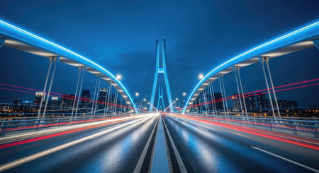 Blue lit suspension bridge at night with vibrant car light trails creating a dynamic urban scene
