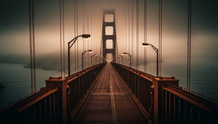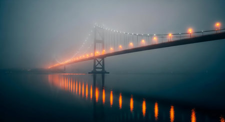 Fog engulfs a suspension bridge creating a mysterious atmosphere at dawn