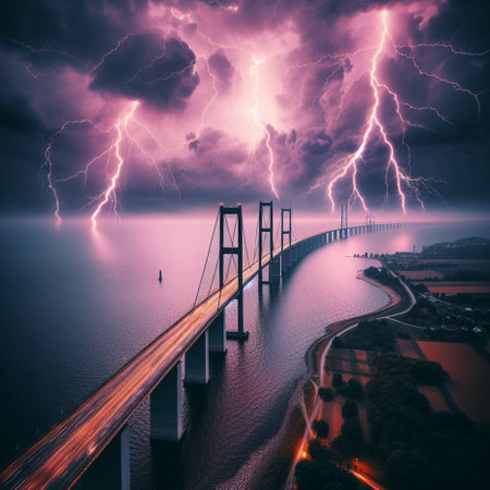 Aerial view of bridge over the river with lightning in the sky