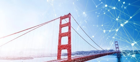 Golden Gate Bridge stands tall in the early morning light, showing digital connections across the structure.