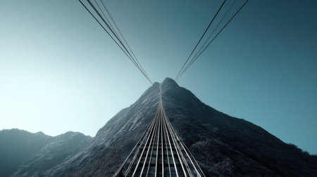 Abstract view of a suspension bridge's cables glowing in golden light, captured in a perfect linear perspective at sunrise