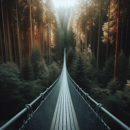 Suspension bridge in a dense green forest with pine trees. AI-Generated image
