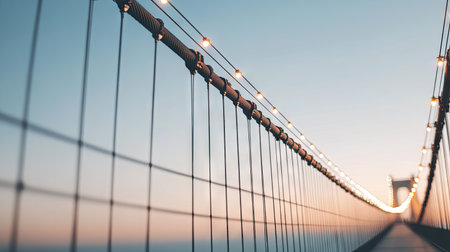 Suspension bridge deck close-up against a soft evening sky, with light reflecting off cables.