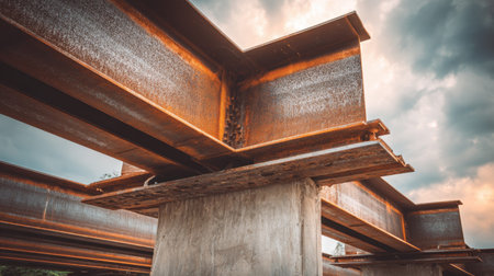 This image shows a close-up view of rusted steel beams supported by concrete at a construction site, with a dramatic cloudy sky enhancing the industrial feel.