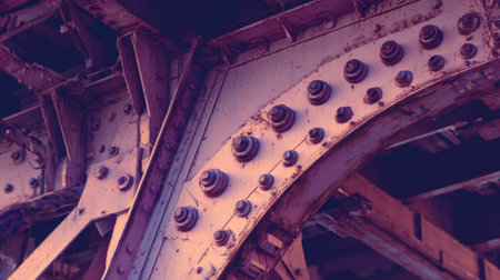 Close-up view of a metal structure showcasing intricate details of bolts and rivets, highlighted by a soft purple hue, representing industrial artistry and architecture.