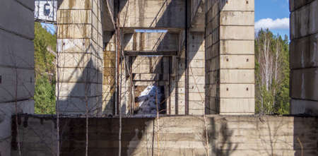 Columns of the railway bridge in the form of a tunnel. Krasnoyarsk Territory, Russia.