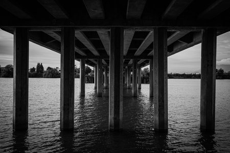 A grayscale shot under the bridge during a cloudy day