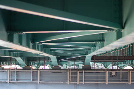 The structural elements of the railway steel bridge. Industrial background. Steel bridge girders