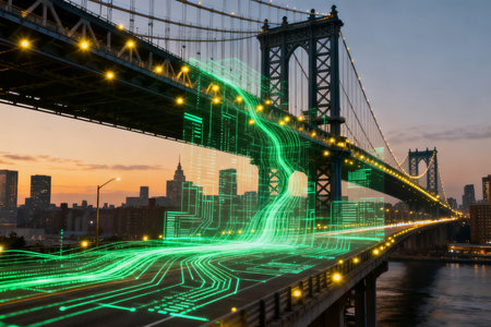 A stunning night view of the Brooklyn Bridge, illuminated with lights and featuring light trails from passing vehicles. The bridge spans across the East River, connecting Brooklyn and Manhattan. The cityscape in the background is lit up with vibrant lights, creating a picturesque urban scene.